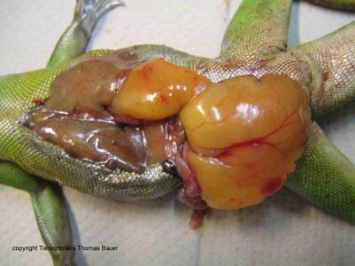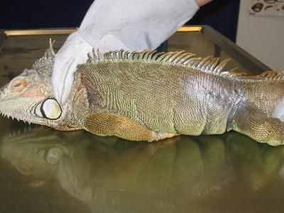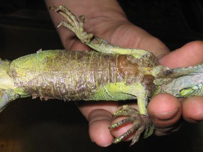 - Junger Grüner Leguan, Kehllappennekrose, alte entzündete Hautschichten am Bauch